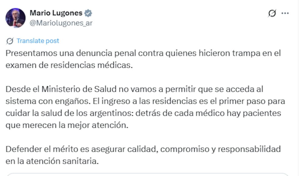 En una publicación en X, el ministro Mario Lugones explicó: “Presentamos una denuncia penal contra quienes hicieron trampa en el examen de residencias médicas. Desde el Ministerio de Salud no vamos a permitir que se acceda al sistema con engaños. El ingreso a las residencias es el primer paso para cuidar la salud de los argentinos: detrás de cada médico hay pacientes que merecen la mejor atención. Defender el mérito es asegurar calidad, compromiso y responsabilidad en la atención sanitaria”.