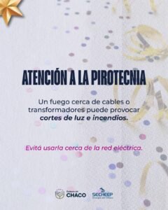 Secheep también recuerda a la comunidad la importancia de extremar los cuidados y evitar el uso de pirotecnia durante las celebraciones de fin de año, ya que su utilización cerca de la red eléctrica puede provocar cortes de suministro, incendios y situaciones de riesgo para las personas y los bienes.