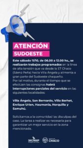 El Centro de Operaciones de SECHEEP Informa que en la mañana de este sábado 11/10, de 6 a 12 horas, se realizará un trabajo programado en la línea de alta tensión que desde la Estación Transformadora Chaco (Sáenz Peña) va hacia Villa Ángela suministra energía eléctrica a gran parte del sudoeste chaqueño.