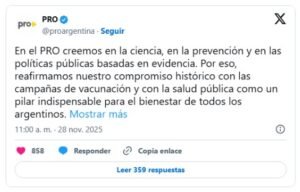 La fuerza política sostuvo además que acompañará “siempre políticas que fortalezcan la vacunación, mejoren el acceso a la salud y protejan a las familias argentinas”, y sintetizó su posición en una consigna: “Más prevención, más ciencia y menos enfermedades que ya creíamos superadas”.