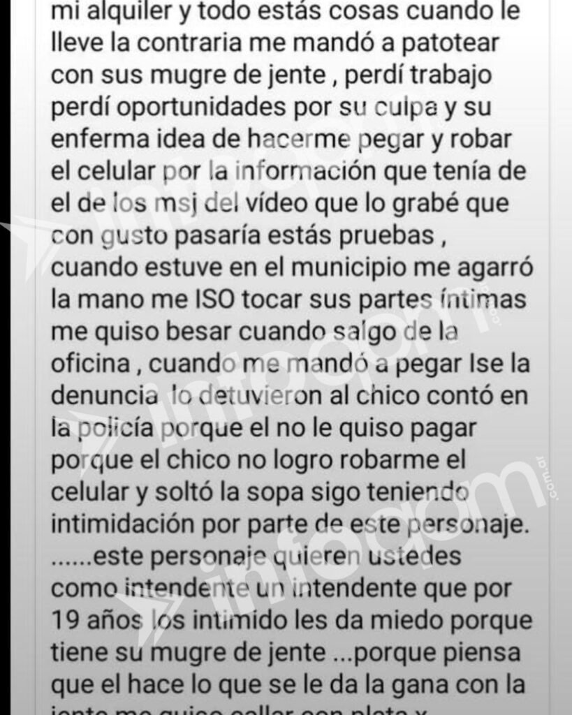 A partir de esa negativa, N.F. habría asegurado haber perdido su trabajo y sufrido hostigamiento. También relató un supuesto episodio de abuso dentro del municipio, donde el jefe comunal presuntamente habría intentado besarla y tocarla sin su consentimiento.