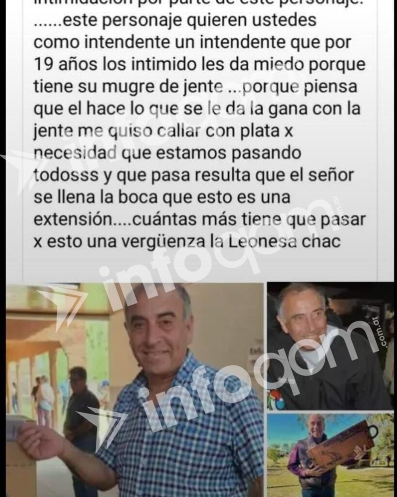 Una usuaria de Facebook identificada como N. F. habría denunciado públicamente al intendente de La Leonesa, el justicialista José Carbajal, por “presunto acoso sexual, pedidos de favores sexuales a cambio de ayuda económica y hostigamiento”. La acusación, difundida a través de redes sociales, incluye capturas de mensajes, nombres de presuntos cómplices y relatos de situaciones de abuso.