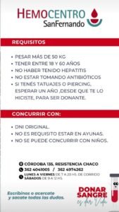 Desde el servicio de hemoterapia recordaron que donar sangre es un acto solidario fundamental que puede salvar vidas y que el procedimiento es seguro. Para poder donar, los voluntarios deben pesar más de 50 kilos, tener entre 18 y 60 años, no haber tenido hepatitis, no estar tomando antibióticos y, en caso de tener tatuajes o piercings, haber esperado al menos un año desde su realización.