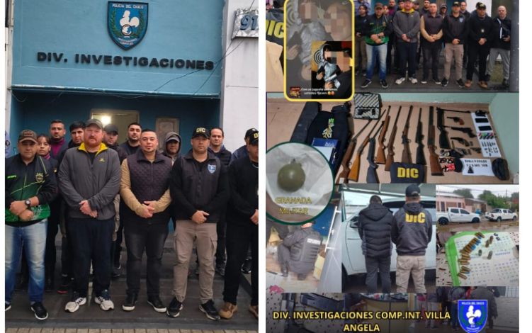 Uno de los hallazgos más relevantes fue el de una granada de mano FMK2 activa, que fue asegurada por personal especializado de la División Bomberos de Villa Ángela para su resguardo.