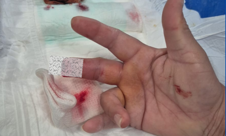 Durante la atención médica, el paciente se tornó violento y mordió a la trabajadora en el dedo mayor de la mano derecha. Como consecuencia de la agresión, la víctima sufrió una amputación traumática de la falange distal, lesión que fue confirmada por el informe médico oficial.