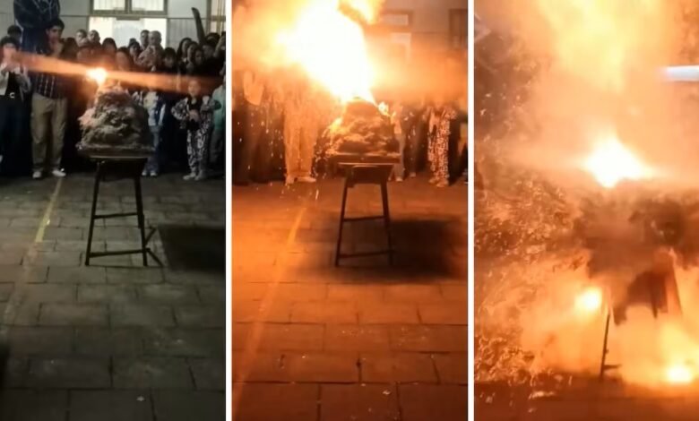 Luego prosiguió a detallar: “Esta combinación va a formar la pólvora que lo que va a hacer es lo que va a explotar. Para hacer esto estuvimos, como unas cuatro semanas para esperar que se seque el barro, pisar bien todo el telgopor para que quede la forma, tener mucho cuidado con lo que vamos a mezclar y, luego de todo eso, tenemos ese volcán», detalló la alumna a lo que una profesora del colegio anticipó: “Lo hacemos erupcionar”, dijo y felicitó con aplausos la explicación de la alumna que procedió a encender el experimento antes del inesperado desenlace.