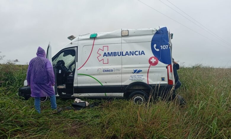 Vuelco de ambulancia en Ruta 16 bajo la lluvia: dos ocupantes resultaron ilesos en Los Frentones
