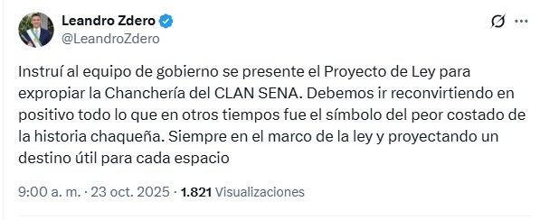 El gobernador Leandro Zdero informó este jueves en X que instruyó a su equipo de gobierno para presentar un proyecto de ley que permita expropiar el predio conocido como la “chanchería” del Clan Sena, lugar central en la causa por el femicidio de Cecilia Strzyzowski.